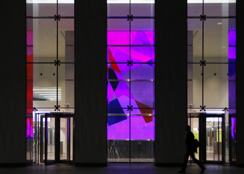 Nul besoin d’aller plus haut pour saisir l’esprit du lieu. L’objet de Mengzhi Zheng le contient tout entier dans la couleur, transformée en énergie. Ce résultat est rendu par une superposition de films appliqués sur du verre, en contact direct avec un tissu de fibres optiques équipé de LEDs programmés RVB. Ces additions et soustractions de tons dessinent une boucle régulière dans le temps, offrant à chaque instant du jour de nouveaux paysages sensoriels aux usagers et visiteurs.