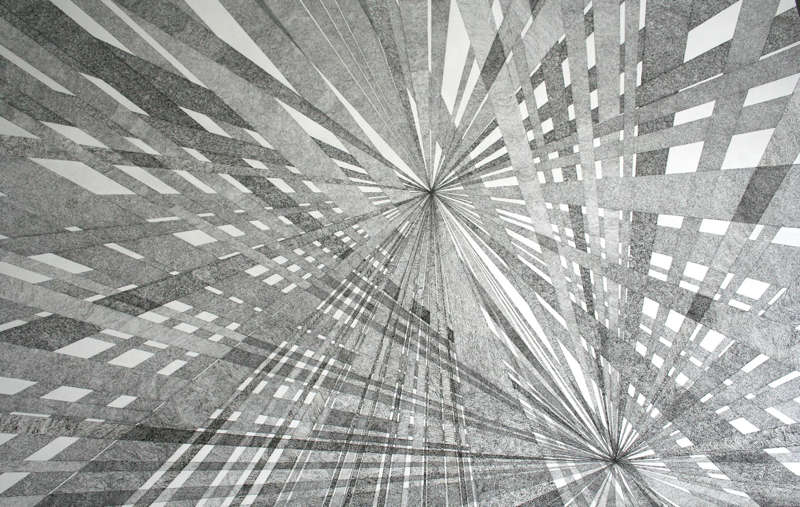 Ainsi, dans les dessins de Nicolas Aiello, la mémoire humaine se maille en lignes hameçonnées. Un secret codé avance doucement au-dessus de chaque grain de la feuille de papier. Ici poussent des rayures, des fissures suturées. Alors la feuille répond, elle se réserve des terrains, elle quadrille des pans entiers qu’elle laisse en jachère, en lumière. Ou, comme elle peut, la feuille halète entre chaque croche de noir.