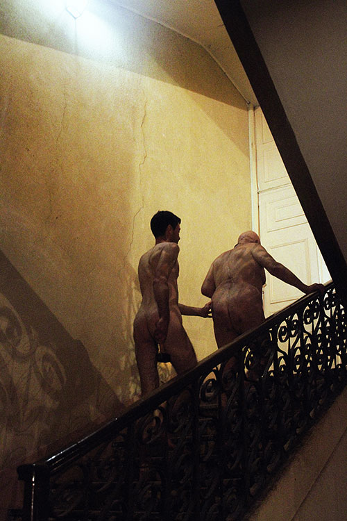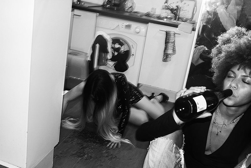 Dans une exposition sur les soirées dans les appartements, il est logique de montrer la phase du vomi. Parce que notre but, dans les soirées, consiste régulièrement à chercher ce qui, dans nos corps, est susceptible de déborder. La jouissance en trop – et puis de trop comme si nous devions nous en punir. Cette image est une mise en scène. J’ai déjà essayé de prendre en photo des amis qui allaient vomir, mais il faut être très rapide, penser aux réglages, à l’angle, etc. C’est compliqué. J’ai pensé plus tard à reproduire l’acte en mise en scène. Je lisais Baudrillard, qui parlait de la photographie comme « nostalgie du présent », puisqu’à travers le numérique nous avons tué dans l’image ce qu’il y avait de réel. Je me disais que nous organisons des soirées en nostalgie d’autres soirées – lointaines, idéalisées ; à partir de là, quelle différence entre le réel et son imitation ?