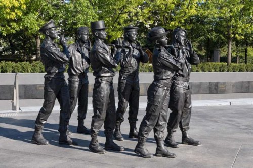 Mais peut-être peut-on encore faire muter la nature même du socle, pour en maintenir l’usage. Ainsi va le propos de Stéphane Vigny, pour son Monument aux Morts pour la France en opérations extérieures, 2019, Parc Citroën (bronze représentant une femme et cinq hommes) centré sur un vide symbolique renvoyant pourtant bien aux deux valeurs des socles ? Nous aurons l’occasion d’y revenir.