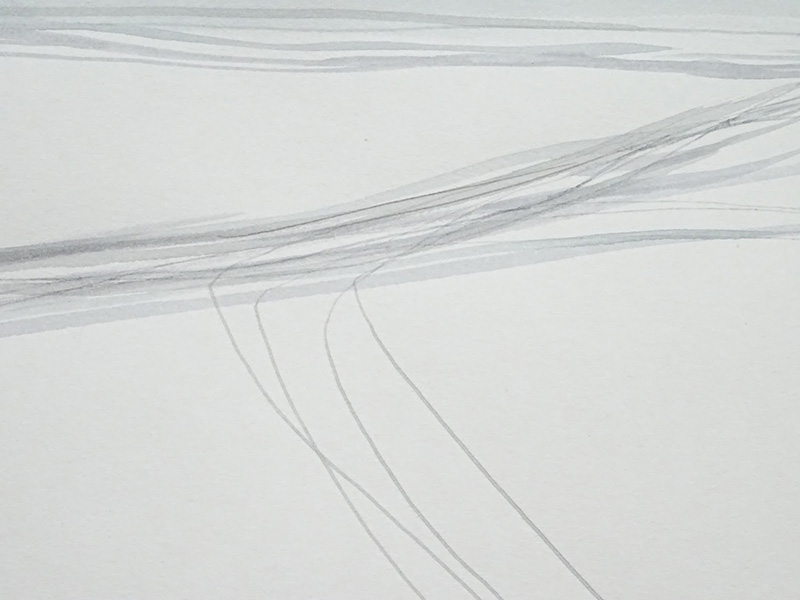 La ligne récurrente, à force de traverser la feuille, fabrique la surface et l’épaisseur, alors j’ai l’impression de convoquer les lignes de niveaux d’eau des cartographies pour raconter une topographie en mouvement. Maintenant que tout dégèle, nous sommes dans l’interstice, le montage contrarié des saisons. Les rapports sont de 90/10, entre sol/ciel, gelé/dégelé, lignes/surfaces, courbes/droites. Je vais découper le papier et faire émerger les îles et les flaques d’eau.