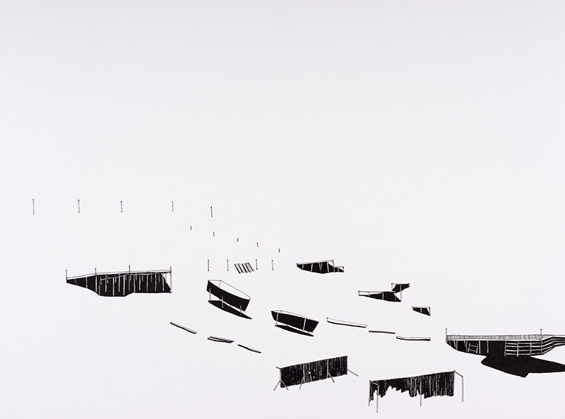 Je suis moins attachée au motif, qu’à la relation du sujet à son espace. Quand je dessine une cabane, je questionne où elle va se poser. Elle n’aura son histoire que par la façon dont elle a d’être sur un sol, ou de flotter ou de laisser supposer qu’elle flotte. Pour dessiner une topographie, je mets le paysage en creux et fais apparaître des structures, des balises, des architectures, des bouts de planche. Comme dans les cartographies de constellations du ciel, un motif apparaît pour que le contexte réapparaisse de façon mentale chez le spectateur. Cela aussi parle des champs de forces.