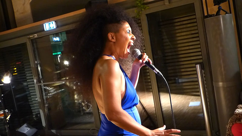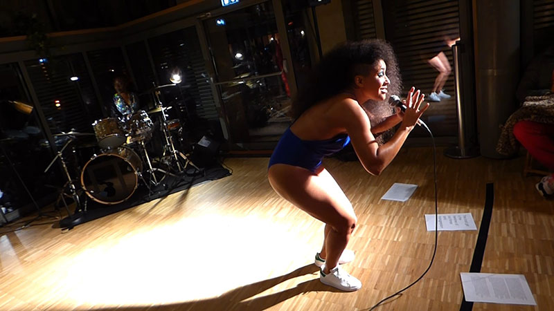 Alors en fait j’aime bien passer d’une langue à une autre, souvent dans mes performances je fais ça, l’allemand, l’italien, l’anglais, l’espagnol, le créole… Là tu fais référence à un poème de Monchoachi qui s’appelle Préserver et qui parle d’un rite initiatique, normalement d’un petit garçon mais que moi j’ai transformé comme si c’était une petite fille. Et à un moment donné il dit « PAS Paroles bébel PAS paroles banda PAS paroles flonflon PAS paroles floup-flap PAS paroles flafla ». Et il dit « m’pas connain, il parle de déblayer chimin l’Ancêtre,… l’Ancêtre est sur sa bouche », en fait ce sont des créolismes. Je considère mon corps comme un canal, c’est comme si ça me permettait d’accéder à une mémoire cellulaire, un background, comme si j’étais mon arrière-grand-père ou mon arrière-grand-mère, qui me renvoie à quelque chose de lointain et qui n’est pas forcément 2022, là maintenant dans notre contemporanéité.