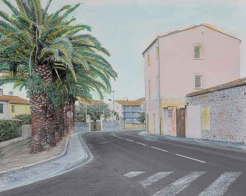 Un premier travail avait abouti à des diptyques juxtaposant mes photographies couleurs et les pastels de Céline. Il portait sur la ville de Pollestres, là où elle vit. La géométrie et les couleurs rigoureuses de mes photographies s’opposaient aux formes déstructurées et aux couleurs fantasques issues de sa vision.