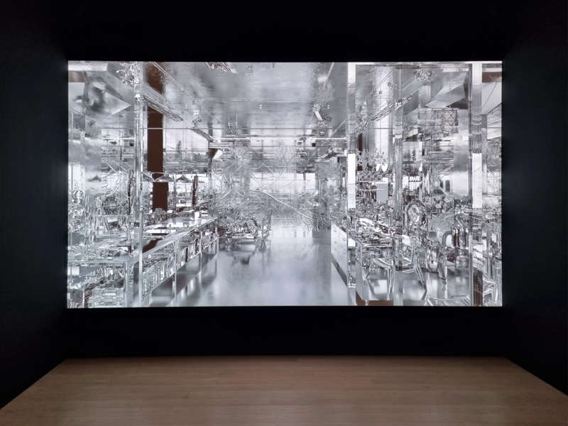 Nombreux sont les peintres à avoir représenté leurs ateliers, plus rares en revanche sont les artistes qui, à l’instar de Nicolas Baier, ont fait œuvre de sa représentation. Ce dernier a en effet modélisé le lieu de l’émergence de ses créations sans omettre aucun détail ni objet. L’atmosphère scintillante qui en jaillit évoque la dorure à la feuille d’or des anciens, qu’ils réservaient au divin. On parle souvent des tubes de couleur qui ont libéré les peintres impressionnistes de leurs ateliers, aujourd’hui ce sont les applications en trois dimensions qui ont permis à Nicolas Baier d’y rester. Même lorsqu’il s’agit de générer le sous-bois de la suite de sa séquence titrée Vases communicants, et ainsi de trouver un équilibre entre architecture et nature, intérieur et extérieur, sans jamais s’éloigner de son ordinateur. Celui-ci est son véritable atelier, ultime lieu du faire aux possibilités infinies en termes de point de vue comme de cadre, parmi quelques notions récurrentes de l’histoire de l’art. Jusqu’aux lueurs des étoiles symbolisant l’inatteignable plus que le lointain dans le contexte de travellings qui, lentement, avalent le temps.
