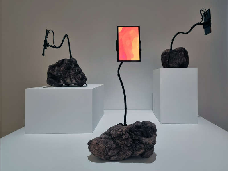 Les sculptures de la série The Prophets de Nicolas Sassoon se présentent sous la forme d’assemblages de roches volcaniques et d’écrans. Le fait que l’artiste ait déposé ses blocs de roche sur des socles leur confère une présence toute muséale. Les contenus de trames animées des écrans auxquels ils sont connectés convoquent l’origine magmatique de ces mêmes éjectas. Une telle association du minéral et du technologique renvoie inévitablement à l’extraction des terres rares qui sont essentielles à la fabrication de nos appareils électroniques et aux centres de data auxquels ils sont connectés. Sans omettre que les contorsions des tiges qui relient les pierres aux écrans leur attribue comme des “caractères”. Mais que pourraient-ils prophétiser en cette époque géologique de l’anthropocène où c’est désormais l’humain qui façonne la Terre à grand renfort de technologies ? Si ce n’est que ces technologies pourraient bien être du côté du poison comme de celui du remède — ce que l’on nomme en grec le pharmakon — comme le pressentait le philosophe Bernard Stiegler.