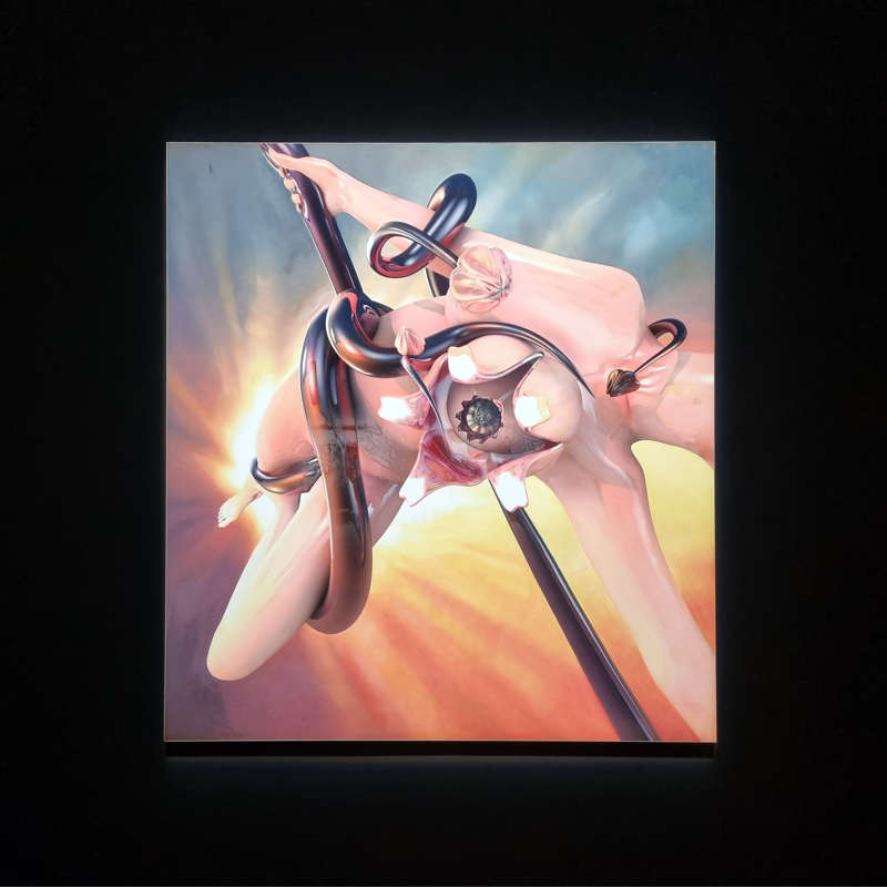 Salomé Chatriot est une artiste aux multiples disciplines qui parfois se croisent et sont toutes au service du corps, de la sculpture à l’interactivité, de la peinture aux œuvres en trois dimensions. Sa série de peintures — émail sur aluminium de fragments ou de corps humain ou autre — cristallise tout particulièrement cette esthétique du passage emblématique de son travail tant il s’agit de représentations picturales qui apparaissent comme véritablement postérieures à l’ère digitale. Les reflets que lui autorise l’émail convoquent la lumière artificielle des applications 3D aux réflexions de l’extrême. S’en est ainsi, nous n’observons plus les images comme nos prédécesseurs de l’avant synthèse le faisaient. L’esthétique de Salomé Chatriot participe d’une forme de post-painting quand nous nous sommes habitués à l’idée d’une tendance post-photographique de l’art. Son geste est ample, bien qu’elle exerce un contrôle méticuleux sur les ambiances lumineuses réfléchies sur les surfaces de ses modèles dont nous ignorons l’exacte nature.
