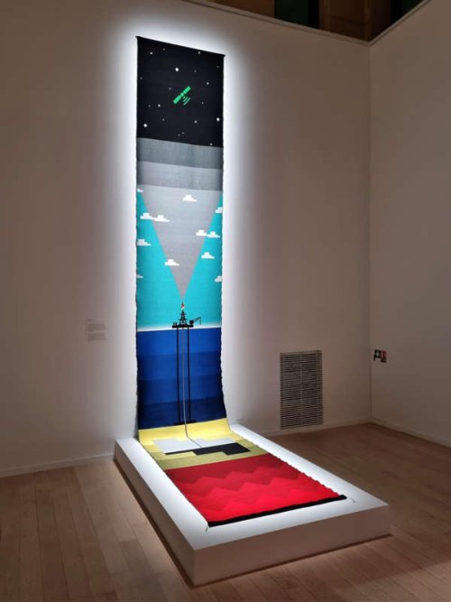 La série Panorama de l’Anthropocène liste les activités humaines qui modifient durablement la géologie de notre planète et ses écosystèmes. Cette énumération initiée par Oli Sorenson pendant la dernière pandémie est résolument graphique. Car les industries, comme celles du numérique dont on sait les actions dévastatrices sur l’environnement, sont symbolisées par des pictogrammes colorés. Le format est unique, celui du carré que les peintres abstraits comme Peter Halley aiment éprouver et qui satisfait les créatrices ou créateurs de contenus sur Instagram. Fait nouveau dans la série de l’artiste, il s’agit de tapisseries effectuées sur des métiers à tisser. On se souvient alors que le métier mis au point par Joseph Marie Jacquard en 1801 fut le premier système mécanique programmable grâce à des cartes perforées. Dans les années 1830, s’en est suivie la révolte des canuts dont l’automatisation menaçait les emplois. Sans doute ont-ils fini par s’adapter, tout comme aujourd’hui les industriels se doivent de se réinventer à l’aune de l’intelligence artificielle et du dérèglement climatique.