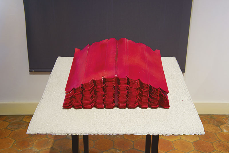 Le livre rouge, 2018, Assemblage de cartons peints, Table lutrin en acier, 40 x 30 x 50cm © Dominique De Beir, Courtesy Galerie Jean Fournier/ Galerie Réjane Louin.