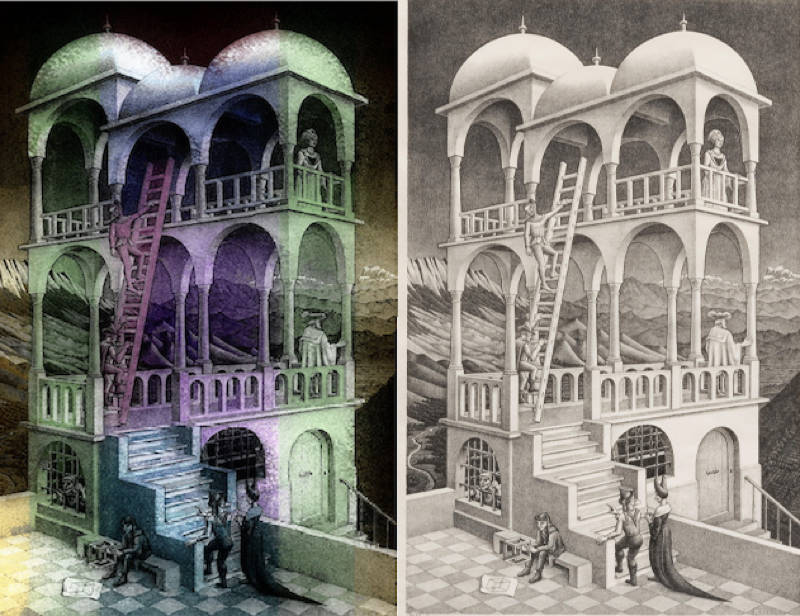 Une architecture, ma préférée peut-être parce qu’elle fait appel au cube de Necker, mais en version impossible, c’est « Belvedere », une autre lithographie. Escher nous transporte dans un Moyen Âge d’opérette avec des acteurs qui sont tous bizarrement fagotés. Le belvédère en question ressemble peu ou prou à un tout petit palais moghol surmonté de trois coupoles et constitué uniquement de deux plateformes en étage à partir desquelles on dispose d’une vue panoramique sur un majestueux paysage des Abruzzes, de belles montagnes.