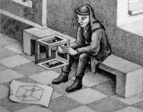 Cet entremêlement de piliers imprime une forte torsion à l’édifice, ce qui semble ne déranger personne, c’est-à-dire ses visiteurs, le couple curieusement vêtu qui monte les escaliers, le vieux sur la première plateforme qui contemple aristocratiquement les montagnes, la jeune femme sur la seconde plateforme qui regarde dans la direction opposée du fait de la torsion, et surtout pas les deux jeunes hurluberlus qui grimpent à l’échelle pour la rejoindre. Personne ne semble affecté par cette extraordinaire architecture qui défie les lois de la logique, aucun d’entre eux vraiment ? ...si, UN. Au pied du belvédère il y a un banc et sur ce banc un jeune homme qui tourne dans tous les sens un objet étrange, un cube fait de lattes de bois, le cube de Necker mais version impossible. Devant lui, à même le sol dallé, il a étalé un plan, et il cherche à comprendre ce jeune homme. Déjà c’est comme si on le voyait le cube à la fois de dessus et de de dessous, sans aucune ambiguïté visuelle telle que celle que je vous ai décrite en évoquant la Gestaltthéorie, mais l’une des lattes, l’une des arêtes, de l’arrière-plan passe au premier plan, un entrecroisement de droites qui lui donne un aspect bancal. Cet objet que tient le jeune homme dans ses mains, ce cube impossible, fonctionne comme le CONCEPT qui a prévalu à la réalisation du belvédère, un bout de maquette en quelque sorte.