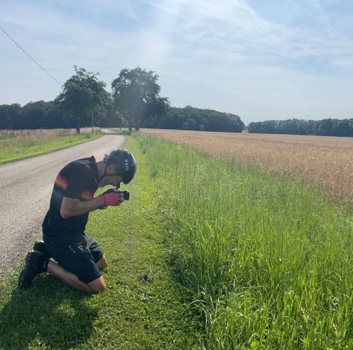 Je suis aussi la tortue. Je prends le temps tous les jours d’écrire six pages de diary dans mon cahier à lignes, d’appeler mon inouïe, d’appeler mes kidzzz en vacances ou pas, estivales, de faire des pauses et des détours pour photographier une fleur, une piste, un champ, une industrie et moi au milieu. De prendre 15 jours pour faire Paris-Nuremberg, alors que ça prend 1h30 en avion, 6h30 en train, 7h30 en automobile. En étant plus direct, je n’aurais peut-être mis que 8 jours. Ce qui compte, ce n’est évidemment pas la destination, c’est le trajet, le voyage.