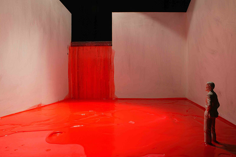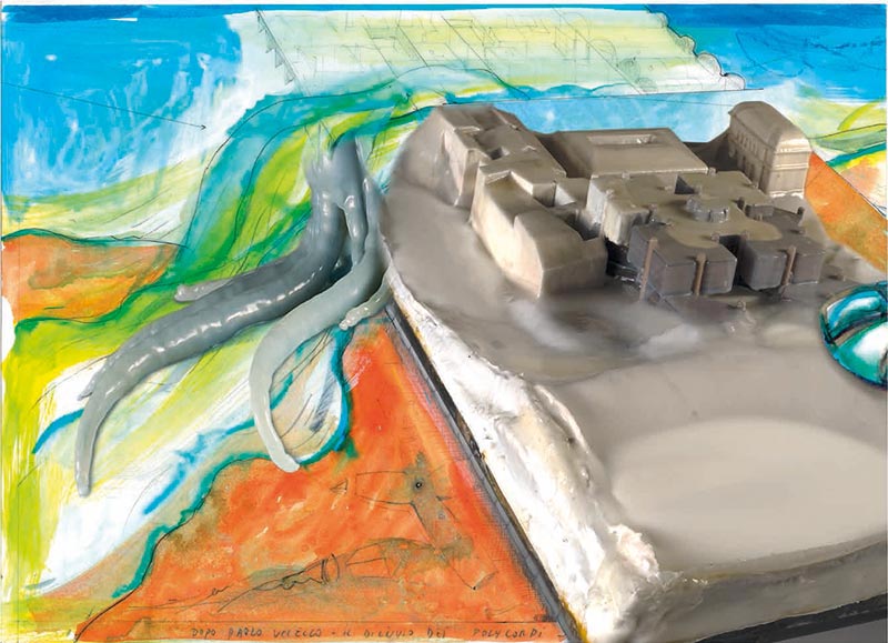 Le polyptyque fait aussi écho au travail passé de l’artiste et à ses liens avec des projets architecturaux : « La maison de l’auteur », une maquette de la maison-atelier idéale réalisée avec un élève de la faculté d’architecture de La Villette dans les années 90 qui au fil des couches de résine successives devient sculpture. Dans l’exposition de la Sorbonne, l’architecture se démembre dans un paysage où la ville est lointaine. Nous devinons la construction, fragmentée dans chaque tableau.