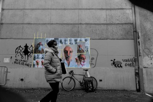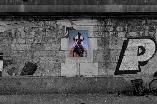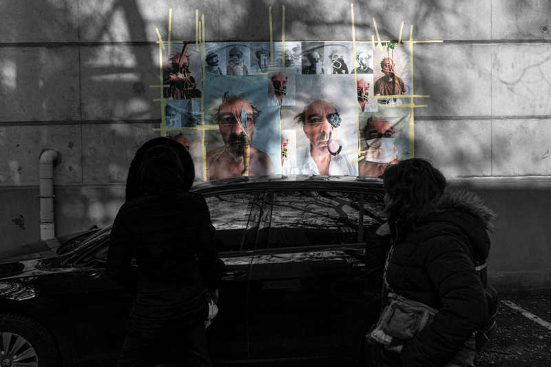 Au début du mois d’octobre, pendant cinq jours, j’ai posé des tirages papier sur les murs et les pierres de quinze rues et places de différents quartiers de la ville plate iséroise. À vélo ou à pied, et avec l’aide de quelques étudiantes de l’école d’art, j’ai parcouru la ville pour montrer les faces clownesques dans des lieux variés qui s’avérèront parfois, par les noms des rues qui commémorent l’histoire, être en résonance tant sur le sujet traité, le personnage montré ou encore plus largement sur la question de la photographie et le traitement des images.