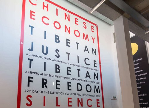 Il prend partie pour les opprimés des régions explorées, comme au Tibet colonisé par la Chine, comme l’illustrent les grands textes peints sur les murs des expositions.