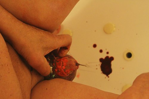 "Cette nuit là, après la cire rouge et les petites aiguilles hypodermiques, j’avais transpercé le gland de Franck avec une grande et longue aiguille, et j’ai voulu prendre en photo le moment où il la retirerait dans sa baignoire. On m’a déjà demandé le pourquoi de cette affection pour le sang qui s’écoule de la chair mutilée, je ne savais que répondre. Je pensais au mythe du saignement de la première fois : cette idée qu’avec la rencontre sexuelle, quelque chose d’intérieur, constitutif, vital, sort du corps et épouse le monde. L’idée qu’il faut fuir du corps pour que le corps existe. Nos séances sont des rituels qui rejouent des mythes, finalement : on pourrait créer celui où le sang de Franck serait aspiré par TK-21, magazine aiguille, magazine vampire, du sang pour le 100. "