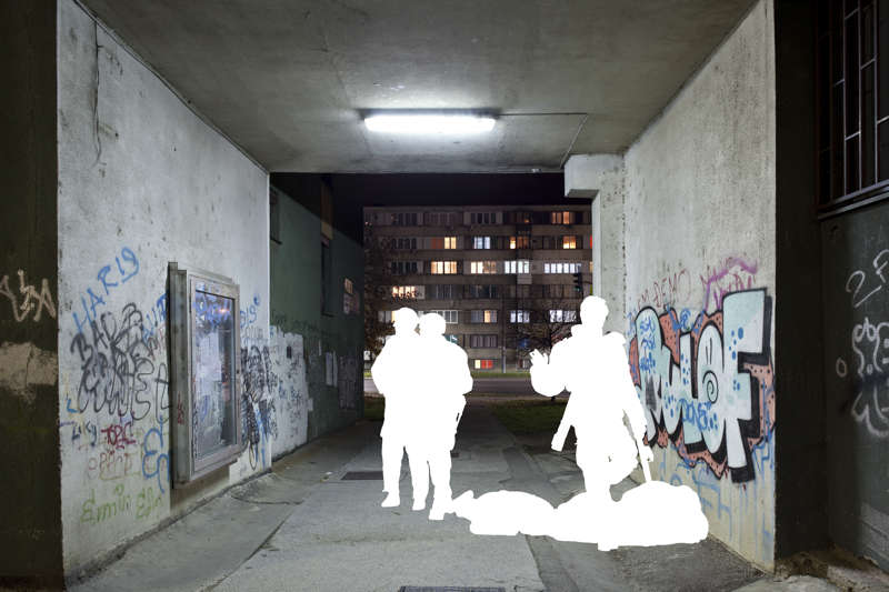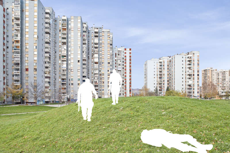 Une génération plus tard, Ici prochainement : Sarajevo dresse un portrait politique de la capitale bosnienne à travers le prisme de l’architecture et du rapport que les habitants entretiennent avec leur territoire. Cette série de photographies rend compte de la lente métamorphose de la ville en extrapolant le vocabulaire visuel de l’architecte : la modélisation en 3D, l’usage de silhouettes anonymes, les banques d’images, les vues projectives, etc. Ce langage, traditionnellement conjugué au futur, interroge ici la place singulière qu’occupe Sarajevo dans le temps présent, entre une nostalgie diffuse de l’ex-Yougoslavie et les rêves d’une Europe qui semble s’éloigner, entre les fantômes d’une guerre figée par les photographies de presse et l’iconographie immaculée de la projection architecturale.