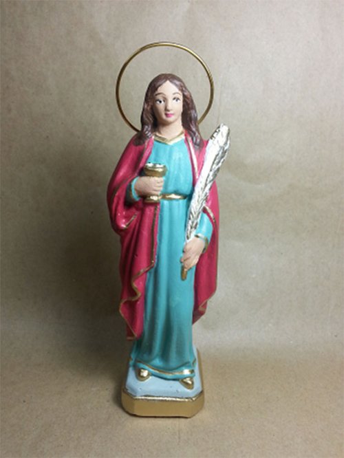 La petite main de la statue de Sante Loussi avait des doigts rosés, finement déliés, reposant sur sa poitrine de plâtre peint et phosphorescent qui semblait contenir quelque souffle lointain et figé dans l’immobilité de la chambre. L’autre main, longue au bout de son bras qui tombait dans le pli des drapés, désignait à ses pieds un étrange calice, soigneusement posé sur un petit socle coloré contre le bas de sa robe. C’était un gobelet sculpté, un pâle et mystérieux récipient, un silencieux et sacré coquetier. Et le petit récipient contenait les formes rebondies de deux yeux grands ouverts. Ils sortaient, émergeaient de la surface pleine. Sainte Lucie offrait ses yeux dans son socle à ses pieds.