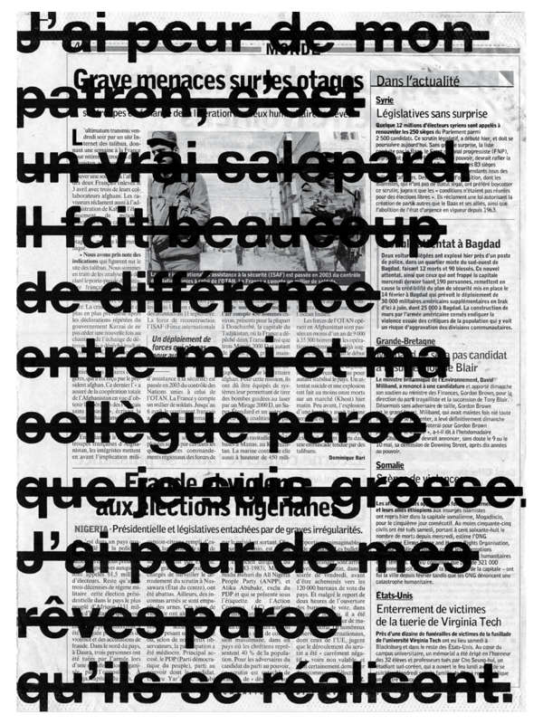 Dans les faits, on a entre les mains des hautes pages en noir et blanc, des images pleine page et des textes déployés en questions à tendance irrecevable ou fragmentés jusqu’à l’énigme. Et d’images en mots, de mots en phrases, aveux ou questions se mettent à voyager, satellites incertains, heurtant-ci, déchirant-là, le mur des évidences et du sens commun.