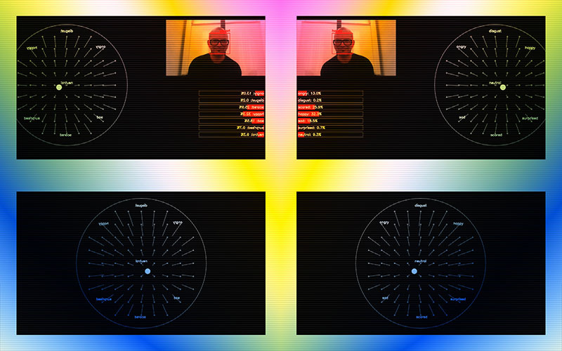 Qui associerait encore l’informatique à l’apparente froideur de ses composants allant du silicium aux métaux de différentes natures ? Lorsqu’une informatique affective s’inscrit à la croisée des technologies de l’information et des sciences cognitives. C’est là le champ de recherche de Frederik De Wilde dont les pratiques oscillent généralement entre les arts et les sciences. Le chiffre sept inclus dans le titre de son dispositif Syn7 présenté actuellement au Centre Wallonie-Bruxelles renvoie au nombre des émotions humaines universelles que les machines apprenantes semblent progressivement découvrir en nous. A condition, une fois encore, qu’on les alimente en grandes quantités de données, ici en joie ou en tristesse entre autres émotions. Equipée d’un système de reconnaissance faciale, Syn7 nous scrute au moins autant qu’on l’observe. Les profils affectifs collectés sont traités en temps réel par l’œuvre qui modifie son apparence en conséquence. Les sons, lumières et couleurs qui la magnifient sont à l’image des états émotionnels de celles et ceux qui se prêtent au jeu. Spectatrices et spectateurs ont par conséquent une responsabilité non intentionnelle sur l’aspect de l’œuvre qui tient ici rôle de convertisseur d’émotions. Bien au-delà d’une efficacité que l’on ne remettra pas en question, c’est l’imaginaire des participantes et participants qui complète l’œuvre par leurs commentaires. Quand, dans le doute, nous octroyons souvent plus de pouvoirs aux machines qu’elles n’en ont réellement. Et que la précision des instruments de mesure, sans l’interprétation qui la complète, n’est guère opérante. Nous sommes donc là face à une forme d’interprétation en cascade : que pensez-vous de ce qu’une machine voie en nous ? Voilà une question du XXIe siècle que soulève une œuvre d’interface !