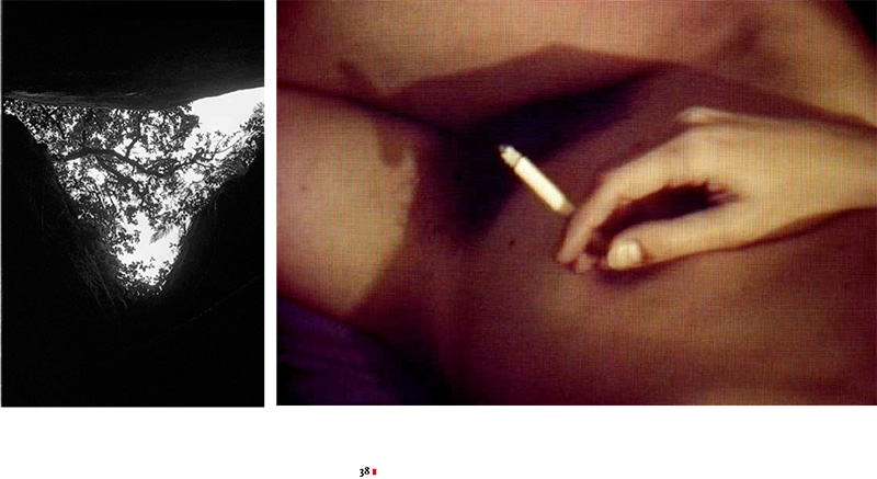 Comme une boutade adressée à Éric Audinet, Tom Raworth [3] intitule sa série « Pense un titre »… C’est sur un rythme staccato, un phrasé en notes détachées (ou « piqué »), qu’il répond aux photographies proposées en diptyques cette fois, toutes relevant très clairement de la vanité (négatif rayé, carcasses de boucherie suspendues à des crochets, nu courant entre les arbres comme suspendu dans le temps…). De courts vers, très sonores (il nous a semblé important de donner, en regard de la traduction de Marie Borel et Jacques Roubaud, la version originale anglaise en ce qu’elles ont, forcément, chacune leur « musique »), « quelques syllabes fracassées » à la fois sans attache et intimement reliées aux images, qui disent les débris, les rebuts, les traces, les reflets, la chair vivante et morte, bleu glacial et rouge feu, les griffures du temps, « la radiation d’un éclair orange / englouti dans le vide », l’« étoile éteinte / disparaissant dans le noir / souriant à la tête de mort ».