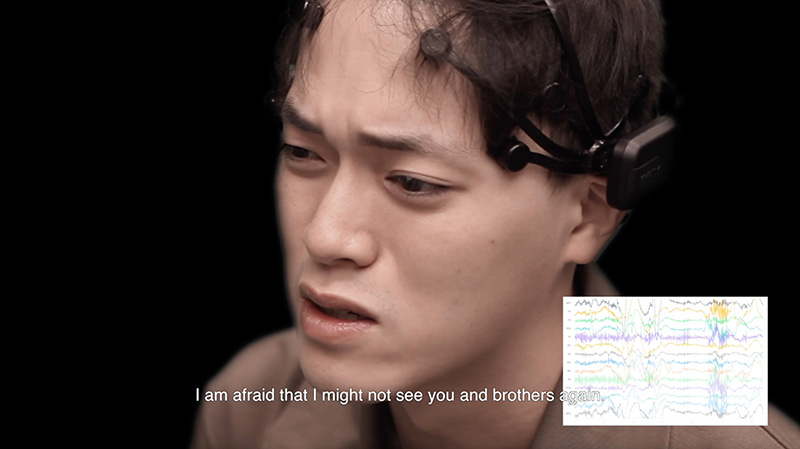 Jaewook Lee [2] : I am glad that you brought that up. Before I answer your question, let me briefly explain about some of the technologies being used to monitor mirror neurons. To see specific locations where mirror neurons are activated, scientists use fMRI (Functional Magnetic Resonance Imaging). It detects the blood flow within functioning areas of the brain. Using fMRI, we can determine which part of the brain is active by tracking blood oxygen levels in the brain. It generates good spatial resolutions. However, what I used for my video work is an EEG machine (Electroencephalography). It is a device that tracks the fluctuations in electrical processes of the brain. It can generate high temporal resolutions. Since the locations for mirror neurons have been examined by many scientists, I wanted to see how the actors’ brainwaves change through time. Especially, I wanted to see how active their brains were when the actors imagined the severe scenes of the Korean War.