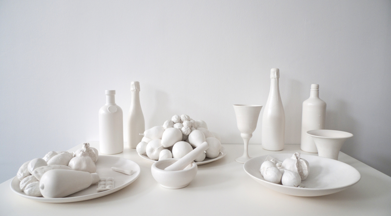 La pièce la plus récente de l’exposition est une Nature morte en céramique. Une installation évolutive qui pourra s’enrichir au fil du temps. D’apparence très classique, on note cependant qu’elle comporte des objets singuliers – entre nature morte et vide poche. Sur une table sont disposées des corbeilles, une carafe, une ampoule basse tension, un petit couteau mais aussi, glissés ça et là, des blisters de médicaments.