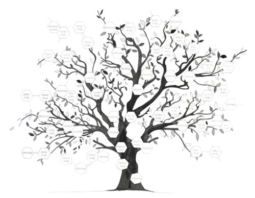 Parfois la pathologie l’emporte sur la personne, on parle de l’oncle alcoolique ou du grand-père dépressif. Encore une fois, ces arbres deviennent comme des partitions car nous n’avons pas les clés de lecture. Toutes ces phobies ont des noms inconnus et improbables. Ces arbres évoquent notamment l’héritage que nous portons, le co-inconscient transgénérationnel apporté par Moreno, qui prend en considération tous les liens d’une personne avec d’autres, vivants ou disparus.