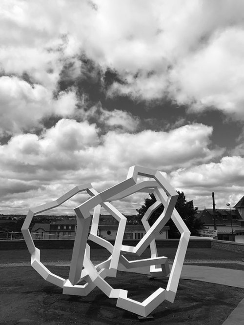 On le sait le travail sculptural de Nicolas Sanhes est porté par une méthode implacable, de calculs et de projections diverses, car c’est la seule voie permettant à l’imagination de se déployer. En utilisant des lignes issues directement de certaines sculptures, ici de celle qu’il va installer à Rodez ou de celle qu’il a réalisée pour Strasbourg, il semble revenir sur ses pas.