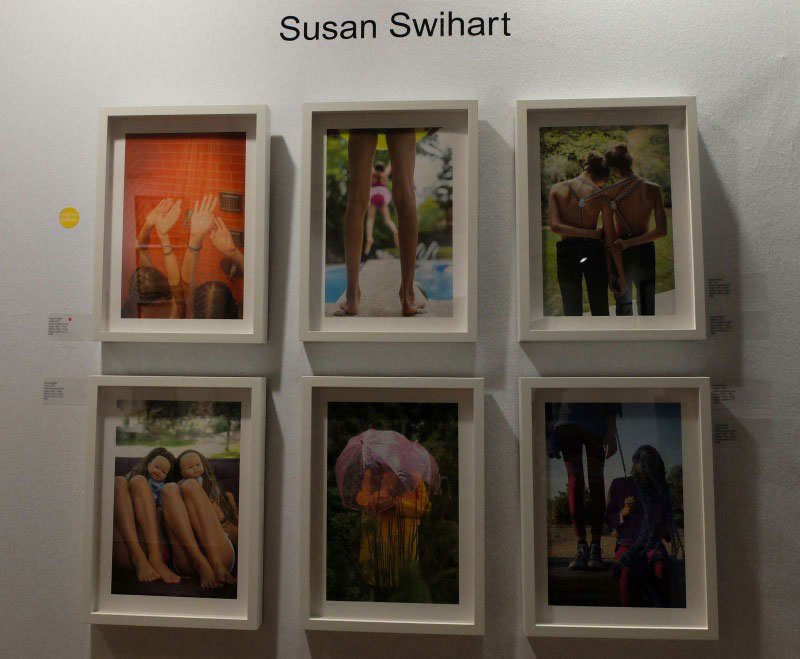 Multitude de petits formats, donc, sur le stand de Fabrik Projects. Délibérément, pourrait-on dire, les séries accrochées ici ne présentent pas même d’unité quant à la mise en valeur de chaque photographie. Chacune des photographes invitées a gardé la présentation qui lui était propre : avec ou sans encadrement, blanc, noir, doré, tailles diverses au sein d’une même série… L’unité se trouve ailleurs. Entre paysages et portraits, il s’agit sans doute davantage d’une même vision du monde que partagent les photographes de Fabrik Projects : pourquoi les paysages (représentés ici en minorité) se présentent-ils le plus souvent d’une façon éthérée, ou même diluée (Marian Crostic, Sarah Hadley, Maggie Meiners, J. K. Lavin, Jessie Chaney) ?