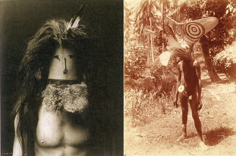 Parfois, aussi, le monde des nuages fait incursion dans notre tricot terrestre. Un agent, un appel à la transsubstantiation est déposé, comme un trou noir absorbe les mesures. C’est le rôle des masques notamment, fenêtres d’un espace-temps magique. Les photographies figurant des êtres humains portant un masque font l’effet de deux mondes qui se rencontrent en une seule entité : le corps réel, dicible, reconnaissable, vers lequel on tend à l’identification. Et le port d’un masque, en lieu et place d’un visage humain, creuse et casse l’image en deux. Comme un vaisseau vers le monde des esprits, le masque a dissous les signes identitaires classiques et par là même nous projette vers l’inconnu. Attiré par la reconnaissance de l’autre, puis refoulé du monde qu’il convoque, le spectateur expérimente, en une seule image l’abîme entre l’ici et l’au-delà. Les circuits visuels sont brouillés par la présence du masque dans le portrait. Elaine Schefer explique : « [...] le masque fait office de pont : en offrant une “hospitalité” temporaire aux “dieux”, il permet au psychisme de faire l’expérience des “esprits” » ; « le masque en tant qu’agent de la métamorphose autorise un accès rituel à des niveaux d’expérience habituellement inaccessible à la conscience ».