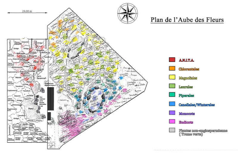 Depuis plus de 30 ans, mon travail de création de paysages, petits et grands, s’est progressivement orienté vers des flores naturelles indigènes, m’amenant de fait à l’observation des biotopes actuels des plantes vestiges qu’ils possèdent. L’envie de réunir à nouveau ces végétaux primitifs, d’après ce que nous montrent les témoins fossiles et les extrapolations de la science génétique, m’est donc naturellement apparue ; elle s’est vite transformée en passion et m’a conduit à la recherche d’un lieu où recréer des scènes disparues depuis des millions d’années. Ainsi est apparue l’Aube des Fleurs.