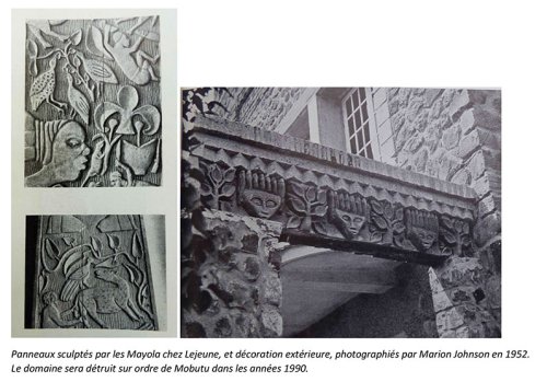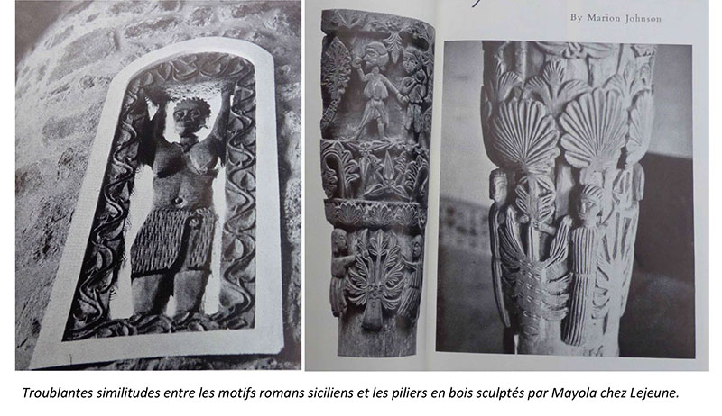 Marion Johnson développe sur quelques pages une comparaison entre l’art roman et l’art congolais qui sera publié en 1952 dans la célèbre revue d’art britannique The Studio, puis reprit dans son édition internationale le mois suivant. Cet article est illustré de photographies qui démontrent des motifs quasiment identiques chez Mayola et chez les artistes romans, à un tel point que ça en est troublant. La dame juxtapose brillamment les similitudes sans chercher à élucider le mystère. Ses photographies des œuvres des Mayola sont malheureusement tout ce qui reste du domaine des Lejeune.
