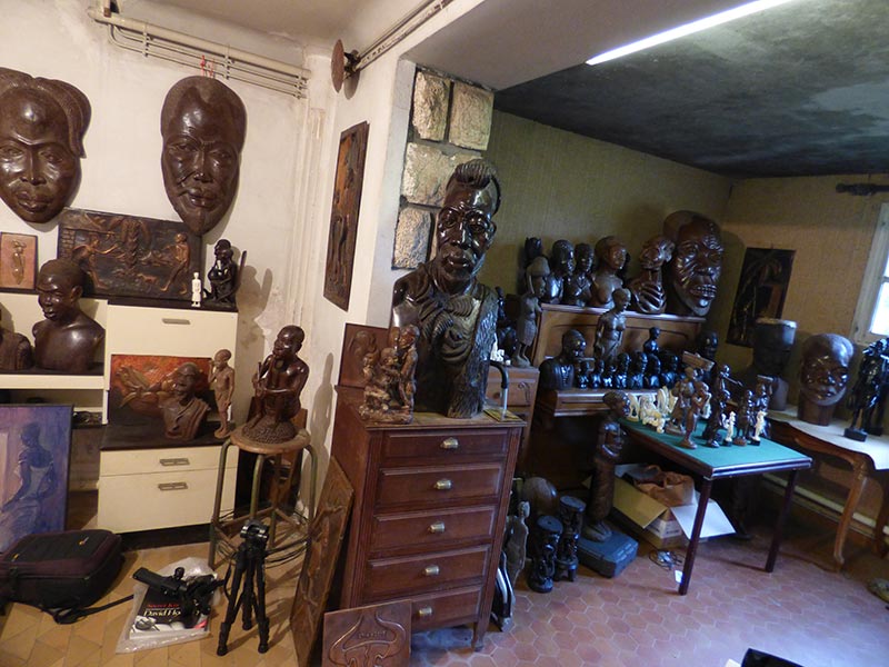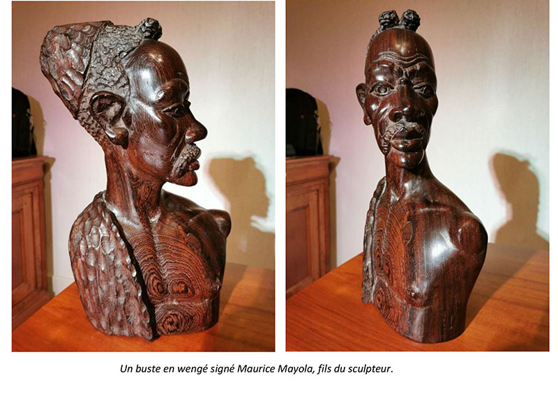 Aujourd’hui installé à Katmandou, c’est le peintre et collectionneur de putalis népalaises Vincent Greby qui m’a fait découvrir un grand masque en wengé signé Grégoire Massengo. L’objet m’a tout de suite beaucoup plu, autant pour ses qualités intrinsèques que par le fait qu’il soit à peu près contemporain des œuvres de Vaiere Mara, sculpteur polynésien auquel je venais de consacrer plusieurs années d’enquête. Nous avons fait affaire et j’ai accroché ce masque chez moi, avec l’idée d’entreprendre quelques recherches. Quelques temps plus tard, je recevais la visite d’un ami qui tombait en arrêt devant ce masque. Il avait une cave pleine de ce genre de sculptures que ses grands-parents instituteurs avaient ramenés du Congo peu avant l’indépendance. Nous y sommes allés. La plupart des sculptures étaient signées sous la base, ce dont il ne s’était jamais rendu compte. C’est ainsi que je tombais sur un premier buste signé Mayola, et localisé Nouvelle-Cité avenue Dibaya.