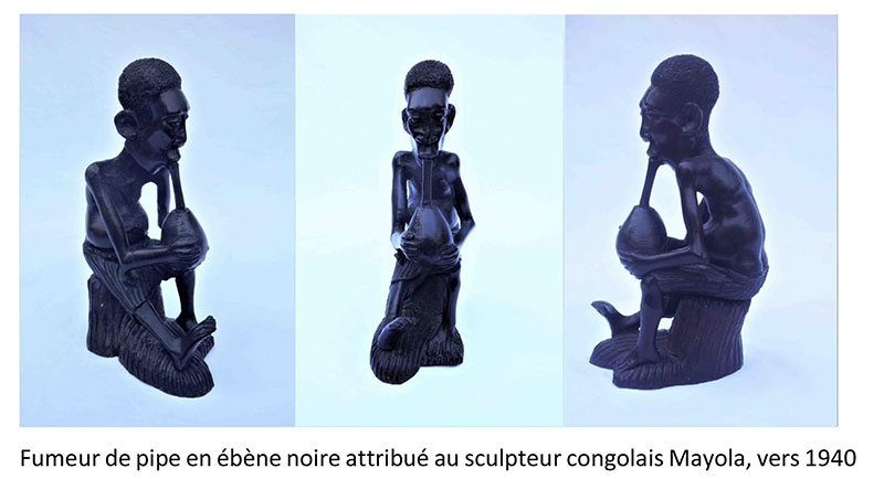 Une autre sculpture n’est pas signée mais peut-être attribuée à Mayola sans trop de crainte de se tromper, puisqu’elle se trouvait avec d’autres pièces signées et qu’on y retrouve tout à fait le style du chasseur à la grosse tête. Il s’agit d’un fumeur de pipe en ébène. Ses bras sont maigres et son ventre rond.