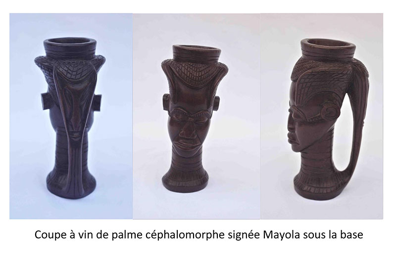 Ensuite vient une coupe anthropomorphe d’une vingtaine de centimètres. Ce qui fait son originalité est qu’elle soit signée. La coupe était conservée depuis plusieurs décennies dans une famille de la côte d’azur française, ce qui permet de présumer qu’elle date de la période Kingoma de Mayola. Si elle datait de la période belge, on l’aurait plutôt retrouvée en Belgique. Cette coupe relève de l’art traditionnel, mais a elle dû être vendue à des colons, pour se retrouver sur la côte d’azur.