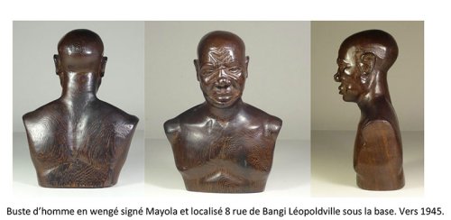 Mayola arrive donc à Kinshasa au milieu des années 1940, alors que des sculpteurs comme Ntonio, Niamba Loemba ou bien encore Daniel Futi commencent à produire des bustes académiques d’une certaine qualité expressive et naturaliste, mais souvent dépourvus de personnalité. En 1952 il remporte le premier prix de sculpture sur bois au Salon des Arts Indigènes de Léopoldville avec un buste de femme congolaise en wengé. Il est difficile d’évaluer son influence au Congo belge. C’est durant cette période charnière que Mayola ouvre son école de l’avenue Dibbaya à Nouvelle-Cité. On connaît un grand buste d’un de ses élèves représentant une femme mangbetu, avec cette inscription sous la base : école Mayola, fait par MilanDou, Quartier artisanal av Dibaya 29/2/57. Ainsi qu’une paire de bustes de l’atelier Mayola datés de 1958. Ensuite plus rien. La date nous permet de savoir que Mayola vécut au moins jusqu’en 1958. Tandis que l’autre côté du fleuve, ses élèves et neveux devenaient célèbres et passaient son style à de nombreux apprentis.