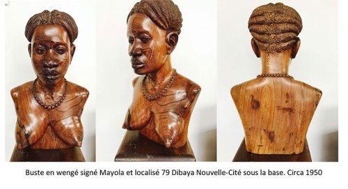 Quoi qu’en dise Marion Johnson, à ce même moment en 1952 une notule de la revue Brousse, éditée par les Amis de l’Art Indigène, dresse le bilan du Salon des Arts Indigènes de Léopoldville. On y apprend que pour la sculpture sur bois, ce fut Mayola qui remporta l’épreuve avec un beau buste en wengé. Un de ces bustes typiques qu’il taillait déjà dans les années 1930, mais dont il avait perfectionné le modèle et les finitions jusqu’à obtenir des sculptures d’un académisme rigoureux, à l’expression grave, aux coiffures sophistiquées, à la finition soignée, au polissage méticuleux. Des bustes qui n’avaient plus rien à envier techniquement aux bustes classiques antiques.