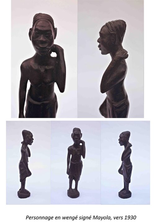 Celle qui est probablement la plus ancienne est une statuette d’un style naturaliste. Elle doit dater des années 1930. Haute d’une trentaine de centimètres, en bois de wengé marron foncé, elle représente un homme vêtu d’un pagne traditionnel le bras gauche replié sur l’épaule comme s’il portait une charge. Peut-être un chasseur de retour de la brousse. La tête est disproportionnée par rapport au corps. Le personnage est un petit homme du commun. On imagine que Mayola a dû produire un certain nombre de ces figurines, dont le style et les dimensions ont été repris par énormément de sculpteurs africains.