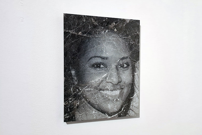 Le tout ayant pour objet de questionner la notion d’identité au travers du portrait quand les modèles, de plus en plus fréquemment, prédominent sur le réel. Et c’est précisément le cas des visages qui ont été gravés au laser sur des plaques de marbre noir puisqu’ils ne sont identiques à personne en particulier. L’artiste les a véritablement « calculés » en fusionnant de très nombreux visages. Mais si l’on prête aujourd’hui aux machines une qualité pourtant bien humaine, celle d’apprendre « profondément » en référence au Deep Learning, nous devons toutefois les alimenter avec de grandes quantités de données. Ici, en l’occurrence, des portraits photographiques. C’est la condition pour que la machine soit à même d’en « inventer » d’autres. C’est devenu chose courante. Nous pouvons aujourd’hui, en ligne et en quelques clics, nous créer des compagnons imaginaires comme le font les enfants que la réalité ennuie. Le grain en niveaux de gris de ces visages inventés leur confère l’aspect des images du siècle dernier, c’est-à-dire à l’époque de leur extrême reproductibilité technique. Il ne viendrait alors à l’idée à personne d’en discuter la « véracité ». Quant au dispositif interactif, il incite les spectatrices et spectateurs à tenir la pose comme on le fait en prenant des selfies. Mais c’est la machine qui « décide » des traitements à appliquer en recalculant l’image captée en temps réel. Au point que l’on ne se reconnaît plus en ces représentations de soi « contaminées » par les visages d’autrui. On pourrait alors attribuer l’aspect pictural de ces hybridations de portraits à la machine qui, en proie au doute face à tant de choix, opterait pour une forme d’approximation inhérente aux artistes fuyant le réel.
