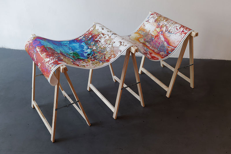 Valentina Vannelli présente Carte d’Atlantide, une photographie, (tirage jet encre sur papier japonais à partir de négatif), posée en équilibre sur deux tréteaux, qui aurait subi l’effet de l’eau. Il s’agit d’une partie du projet Mémoire d’Atlantide pour lequel l’artiste a expérimenté le support photographique comme un territoire. L’eau a transformé l’image et un nouveau paysage émerge. Dans cette œuvre, aux plages de couleurs fluides, les lignes sont des indices d’une carte. L’artiste s’est inspirée des lectures du Timée et Critias de Platon, dialogues où le philosophe introduit le mythe d’Atlantide, cette île dont le destin est de disparaître dans la mer. Photographie et cartographie, deux systèmes de figuration et de mémoire d’un territoire se rencontrent. La photographie a enregistré différents passages et montre une diversité de strates temporelles. En effet, pour l’artiste « la carte est un document qui permet de “dessiner“ les espaces politiques, économiques et sociaux qui changent le territoire. Si le support photographique est pensé comme un territoire, afin de pouvoir décoder les mutations subies par l’inondation alors, le négatif devient “carte d’un ailleurs“ [2] ». Cette installation convoque la notion de temps, la transformation des territoires et le pouvoir de la carte comme mode de représentation des paysages.