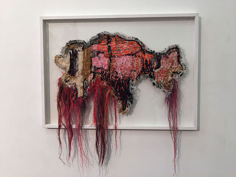 Brankica Zilovic interroge le pouvoir de la carte comme support pour proposer d’autres façons de voir le monde et d’envisager la possibilité d’un déplacement des frontières. À l’aide du médium textile, que ce soit par le biais de la broderie, du crochet, du tuftage, de la couture ou bien d’autres nombreuses techniques, l’artiste évoque la fragilité et la complexité du monde. Ses cartes composées de fils de laine unissent l’art et l’artisanat. Elles font surgir des récits et des histoires des pays aussi bien personnelles que collectives et en particulier, la Serbie, son pays d’origine. Embrace again, son installation où des fils rouges descendent, détricotés de leur maille, suggère un monde qui se délite. L’artiste précise : « La carte, de ma perspective possède deux fonctions, une dans sa réalité des projections, et une seconde, plus captivante, dans sa force par rapport à l’imaginaire, où la carte devient un prétexte de convoquer, interroger et réinventer le monde sans ses nouveaux concepts et alternatives, comme une chimère, une utopie, et comme une technique de réveil et de prise de conscience collective. [1] » Le fil est vecteur de liens, de passages, de réseaux, de parcours. Nouer ou dénouer convoquent, dans les œuvres textiles de Brankica Zilovic, le besoin de bouger les limites entre les pays et de construire un autre monde.