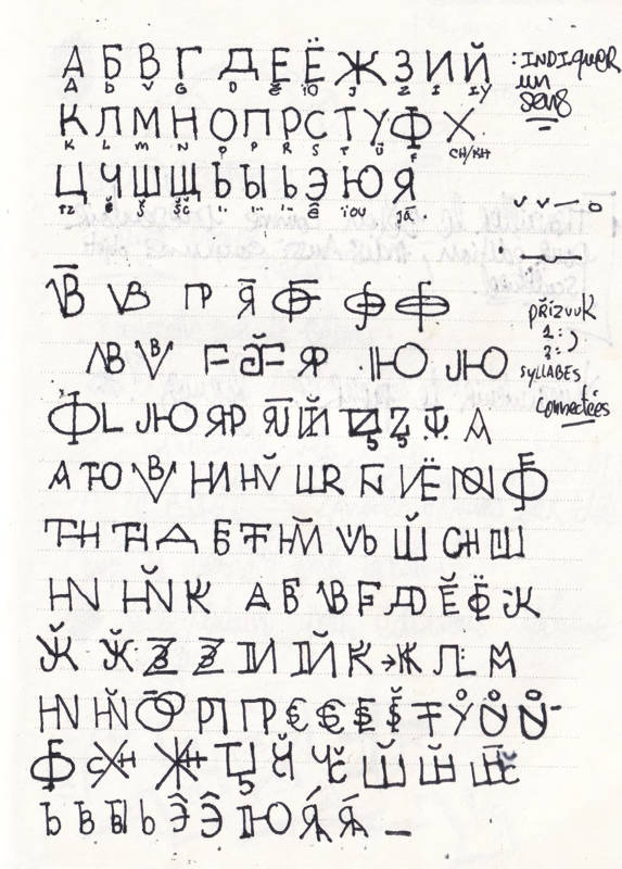 Le Cyrillatin est le résultat d’une dizaine de travaux autour de la langue et des alphabets que Kent Robinson produit depuis 2014, lors de nombreux allers-retours entre les deux continents linguistiques que sont la France et la République Tchèque. En 2016, il va tomber en amour devant la sérigraphie et l’alphabet cyrillique. De cette rencontre polytechnicienne, il va produire plusieurs œuvres ; d’abord une série d’affiches sérigraphiées, qui recensent les mots en tchèque qui existent sans voyelles ; la série ČVRTVLK est perturbante pour un latin. Puis il produit un premier livre totem, microédité, qui entremêle déjà les alphabets, dans une saturation d’écritures manuscrites d’une densité impressionnante, renforcée par le choix d’un papier transparent : une fièvre scriptique, la maladie de celui qui maîtrise depuis peu une nouvelle langue, comme un enfant qui n’en reviendrait pas de savoir écrire et qui, pour s’assurer que son pouvoir nouveau ne va pas disparaître, décide de ne plus jamais s’arrêter.