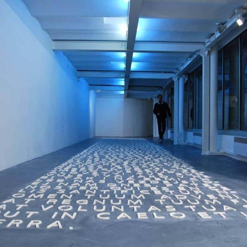 De cet exercice de l’intime qui produit un nouveau sens, il va en tirer une installation-performance, intitulée Prayers, qui voyage encore aujourd’hui [2]. À genoux comme le croyant devant son Dieu, Kent Robinson passe des heures à construire au sol, lettre par lettre (faites de plâtre volatil), des phrases issues de prières qu’il récolte lors de rencontres où la thématique de la croyance est abordée. L’œuvre n’est donc jamais la même et toujours inachevée ; comme ces lettres fragiles, le texte est éphémère, comme avoir foi en l’art est fragile. Chaque œuvre du dispositif Prayers est donc une ode à la fragilité et une performance mémorielle.