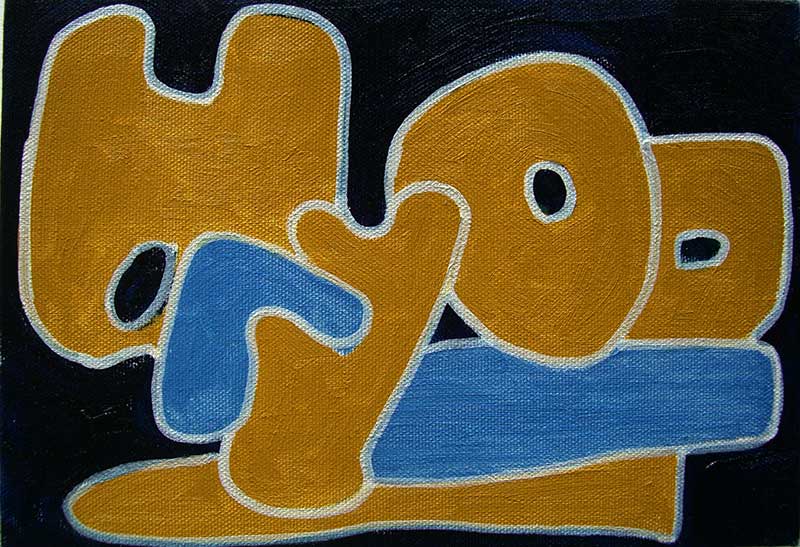 D’autres fois encore, les lettres semblent avoir été tatouées sur le visage. Une des œuvres mettant aussi en scène un visage, résume parfaitement le propos. La bouche est formée d’une lettre ou de deux lettres et le nez lui aussi d’une autre lettre. Le fait que cela représente un visage, c’est nous, spectateurs, qui le construisons mentalement. Nous sommes, ici, face à une œuvre qui dans la peinture occidentale relèverait de l’art de l’icône plutôt que de celui de la peinture profane qui s’est développée après la Renaissance.