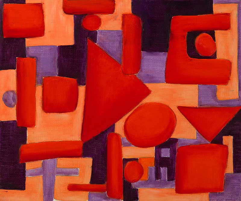Certaines toiles sont composées de lignes géométriques de couleurs vives. L’image est à la fois lettre et objet, signe et représentation d’une chaise ou d’une table. Nous sommes au point de jonction entre art et design, entre signe et forme. Dans d’autres œuvres faites de petits carrés de couleur sont strictement géométriques. La ligne et la lettre se mêlent pour faire émerger une forme abstraite et concrète à la fois. On est, ici, au cœur de ce courant artistique que l’on nomme art abstrait.