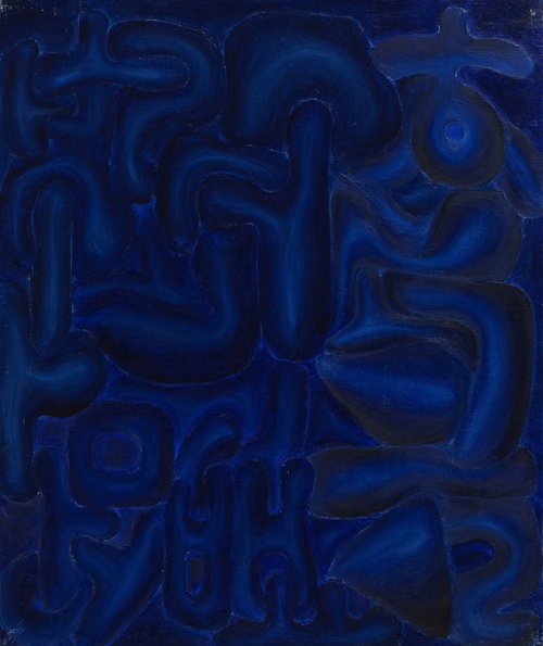 Certaines de ces toiles sont à rapprocher d’œuvres de Paul Klee mais aussi des grands N’tschak des peuples Kuba, en Afrique, par exemple. Dans ces œuvres des éléments plastiques, des lettres ou des signes, dessinent littéralement des paysages et mettent en scène le mouvement de la pensée.