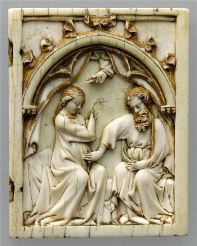 La Visitation a été au contraire souvent montrée. C’est, dans toute la Bible, la seule conversation ayant lieu entre deux femmes, et, avec l’Annonciation, ce sont les deux seules scènes bibliques montrées du seul point de vue d’une femme, sans mari et sans fils. Marie est donc partie trois mois chez sa cousine Élisabeth, elle aussi enceinte malgré son grand âge. Leurs ventres tressaillaient et elles s’étreignaient, émerveillées devant le mystère de la naissance : c’était pour Marie le noviciat d’une grossesse qui la dépassait. Quand elle est revenue à Nazareth, Joseph était inquiet, il doutait. Le doute de Joseph est une scène que l’on représente peu, très peu de peintres ont abordé ce thème. Or il existe au musée de Cluny à Paris un petit ivoire du XIVᵉ siècle, carré de deux pouces de côté : Joseph appuie de biais sa main droite sur le ventre enceint de Marie, alors que Dieu le Père tend deux doigts protecteurs vers elle, pour dissiper les doutes de Joseph. Comme dans la fresque de Piero della Francesca, la robe de Marie semble fendue pour libérer son ventre trop gros, et la main de Joseph se pose sur cette entaille.
