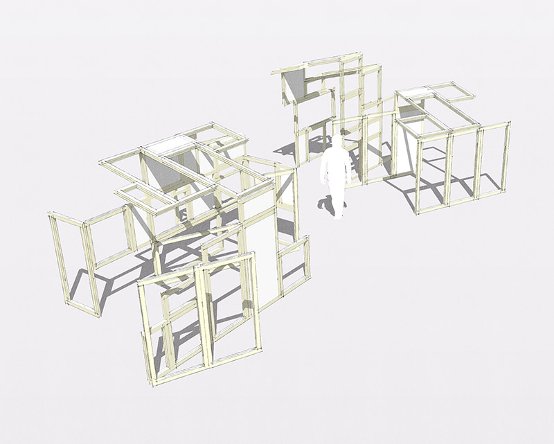 Ce changement d’échelle permet, par la relative finesse des armatures, à la fois d’investir au sens le plus strict un espace d’exposition par une œuvre de grande taille et, par la légèreté des éléments de construction et l’absence de « murs », c’est-à-dire d’élément de bois qui viendraient fermer la structure, d’offrir au regard la possibilité d’accéder à ce que l’on pourrait nommer une conscience modifiée de l’espace.