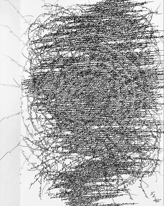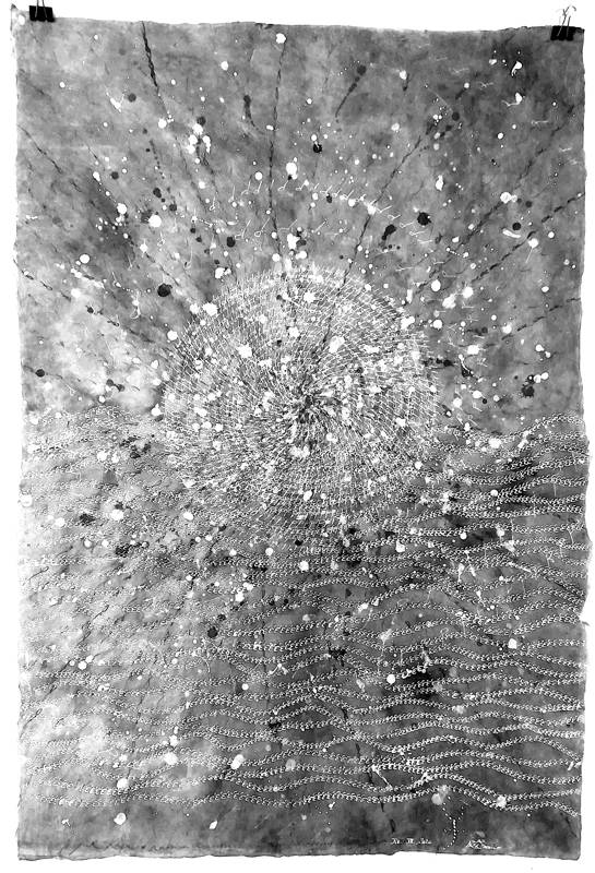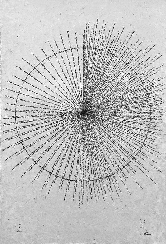 Sono le ‘riflessioni’ originarie di un ‘pensiero visibile’ che vive nei riflessi obliqui dell’impersonale. È una ‘scrittura visiva’ che, immersa/emersa nella liquidità della materia-inchiostro, incisa nella diramazione o successioni delle linee ‘topo-grafiche’, dei flussi che curvano lo spazio che formano visioni labirintiche della scrittura, anche quando sembrano comporsi in ordinata testualità. Una interferenza tra texture e diagrammi geometrici nelle cui pieghe s’insinuano arabeschi estatici, cifrari d’enigmi orientali, erranti ana-grammi della memoria. Una pulsione memoriale che non ha cose né luogo ma ‘solo’ il gesto che ‘inizialmente’ la muove. Un gesto che è radice proliferante – in nome : Rhizoma !– delle espansioni atemporali della scrittura desiderante che rivoluziona la Storia nel ‘controverso’ del suo silenzio..